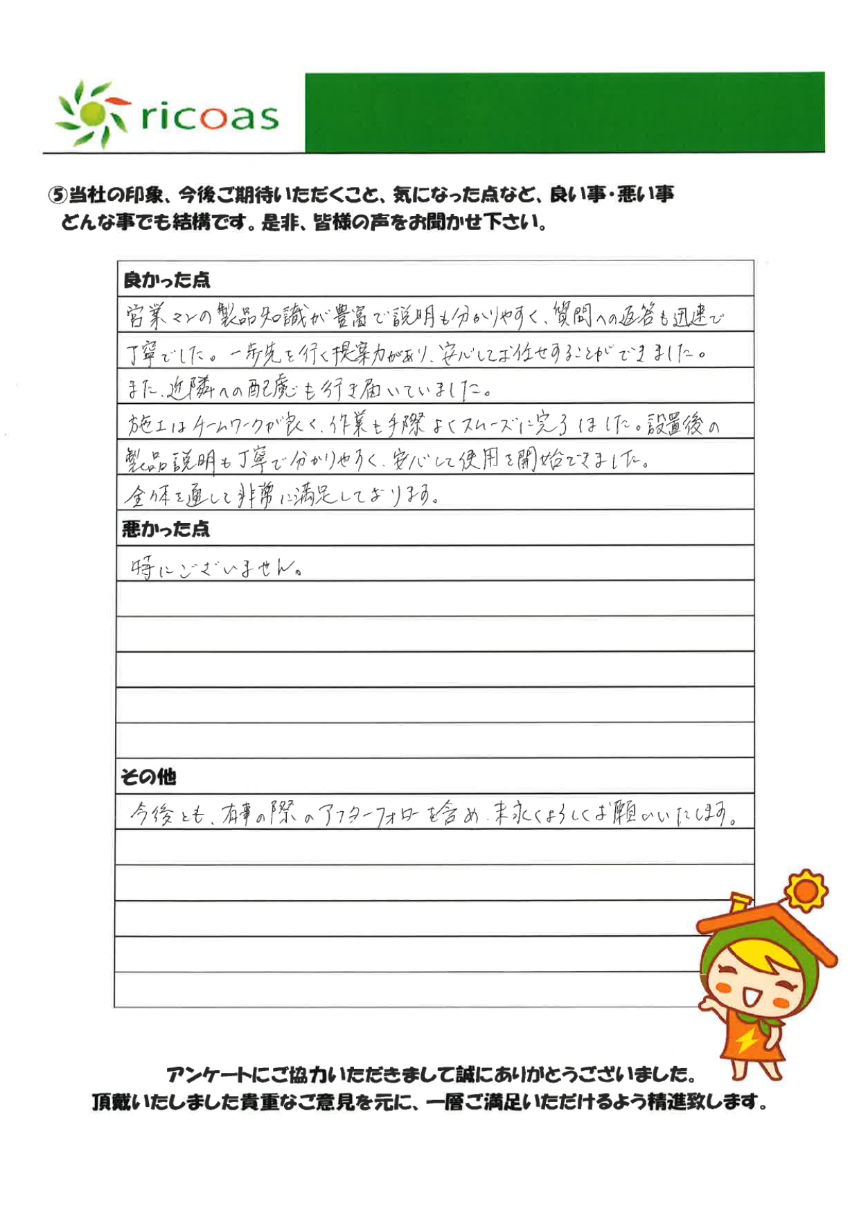 営業担当の製品知識が豊富で、説明もわかりやすく、質問への返答も迅速で丁寧。一歩先を行く提案力があり、安心してお任せできた。また、近隣への配慮も行き届いていた。施工はチームワークも作業の手際も良く、スムーズに完了した。設置後の製品説明も丁寧でわかりやすく、安心して使用開始できた。全体を通して非常に満足。